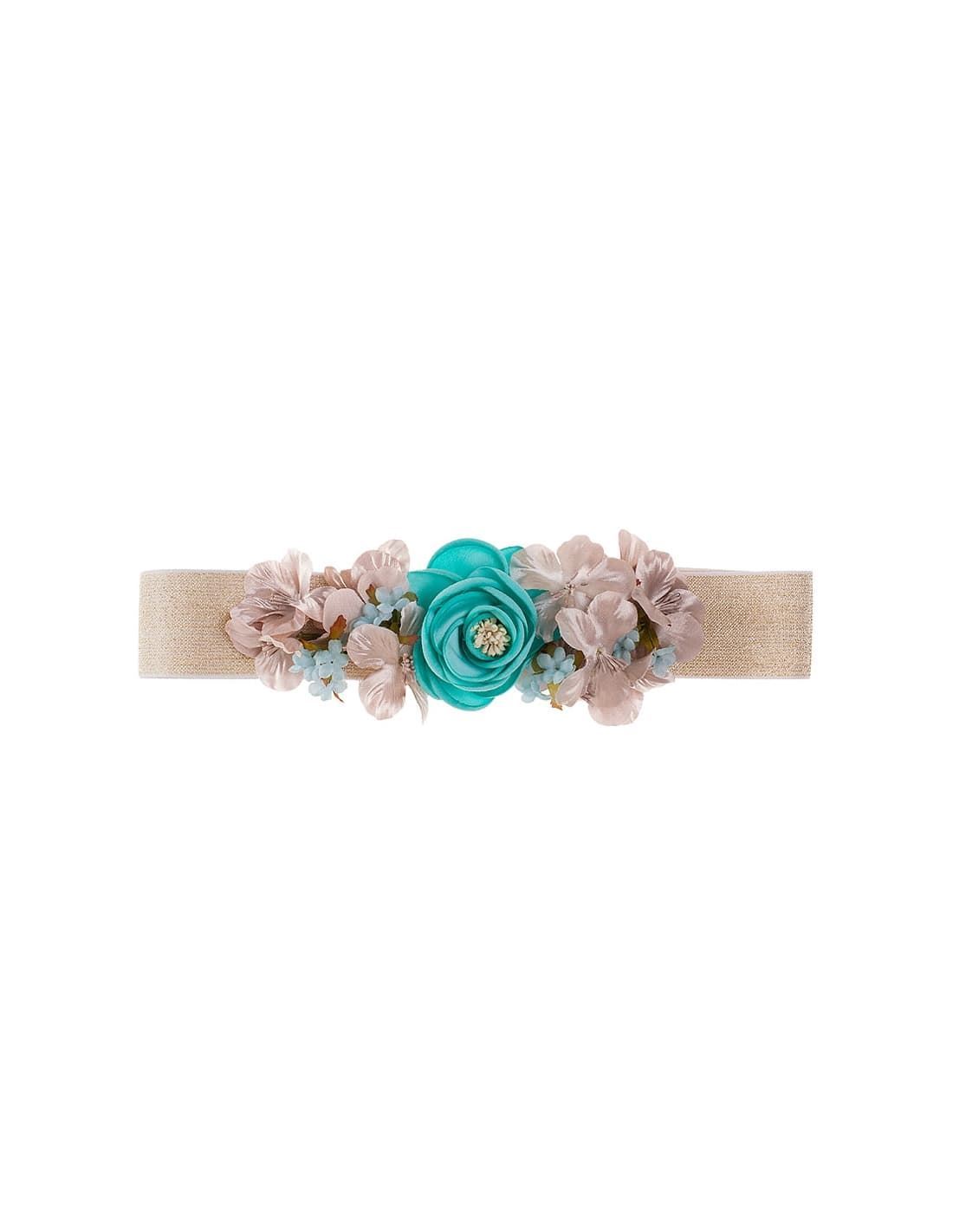 Cinturón de fiesta adornado con flores en diferentes tamaños y texturas. Con cierre trasero, hebilla en color dorado.