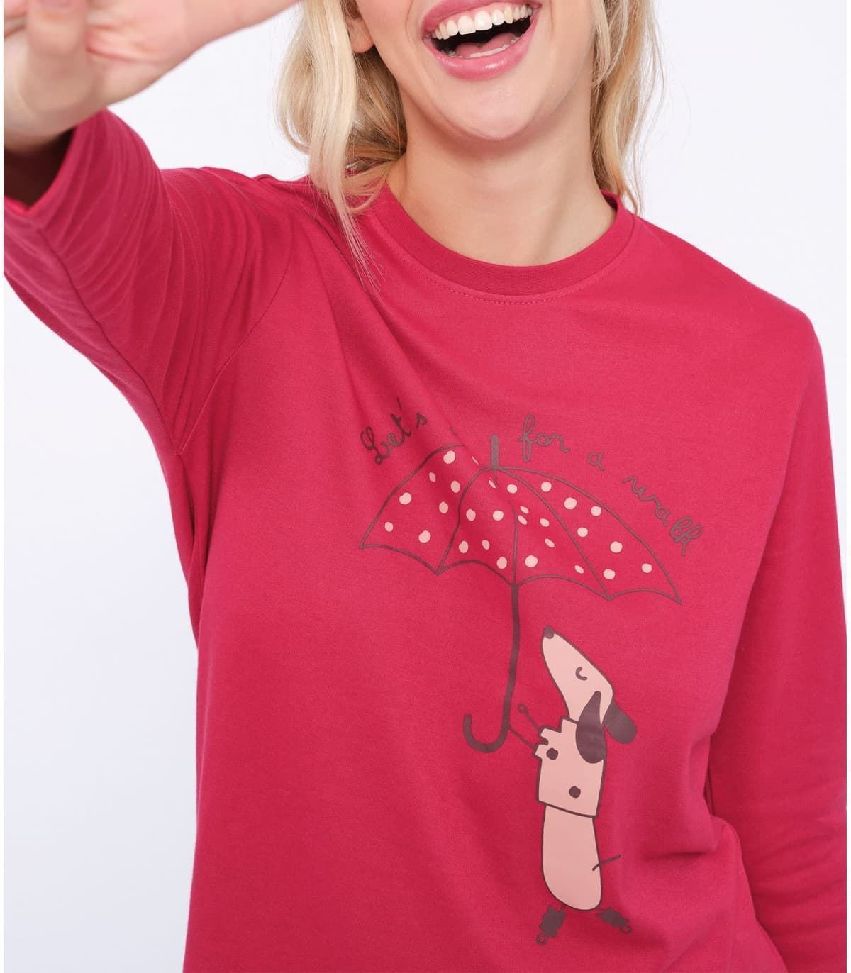 Pijama compuesto por camiseta con estampación y pantalón con estampado de topitos y puños. Lazo en cinturilla y bolsillos laterales